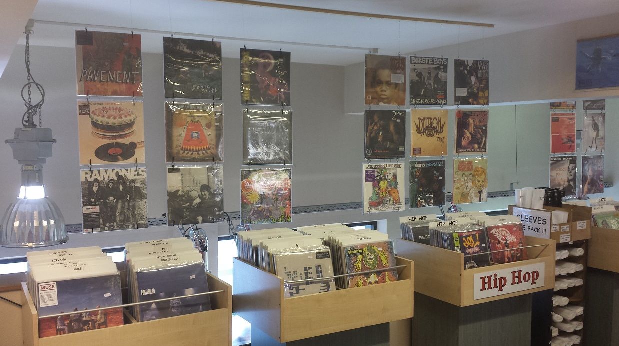 Inutile d’entrer pour deviner son produit phare… Des vinyles à n’en plus finir arborent la devanture et ne laissent percevoir que quelques bribes de l’intérieur. La pierre grise et usée de la façade marque un contraste brut avec les pochettes neuves et parfaitement alignées des différents artistes.